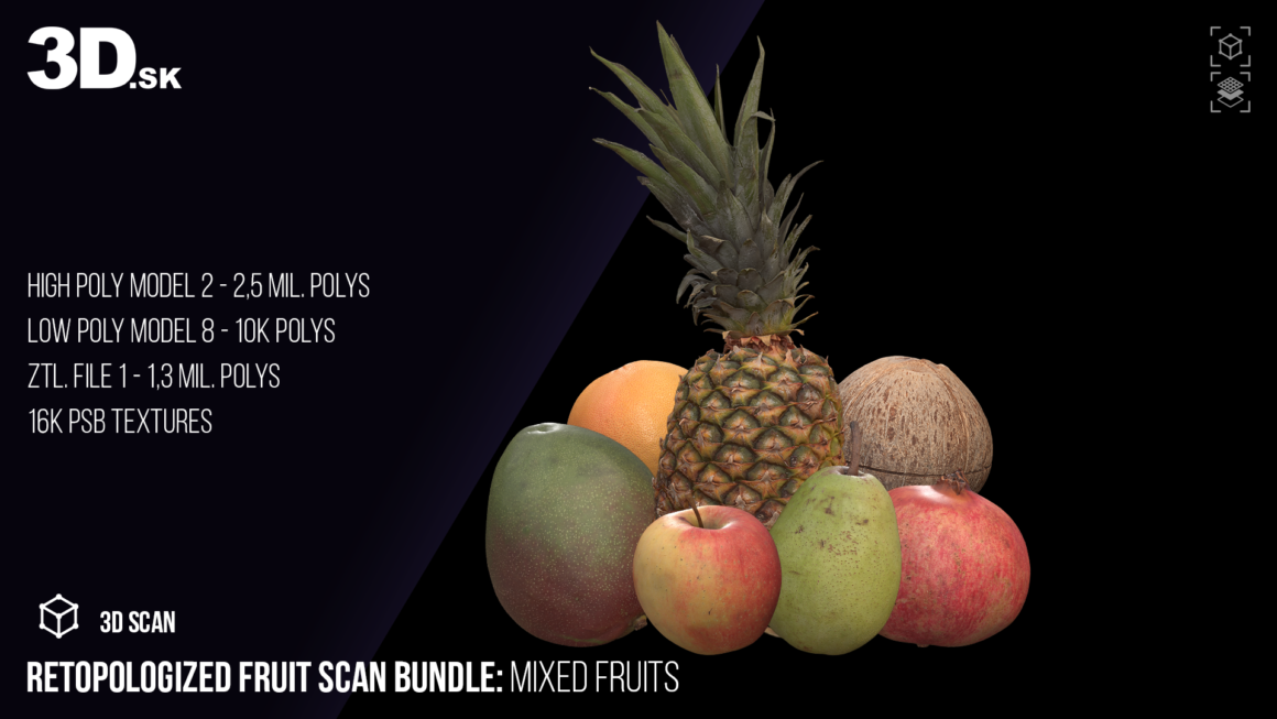 This article showcases several retopologized fruit models created from real 3D scans available at 3D.sk and collected in the Retopologized Fruit Scan Bundle – Mixed Fruit on ArtStation.